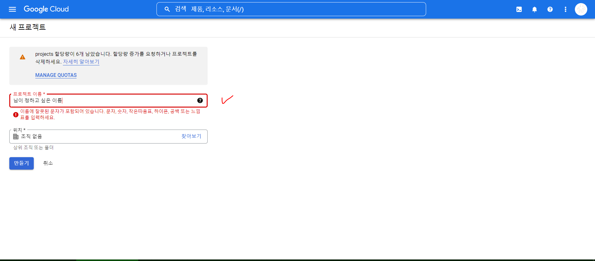 Google Cloud 옆 화살표 모양 누른다음에 새 프로젝트 생성