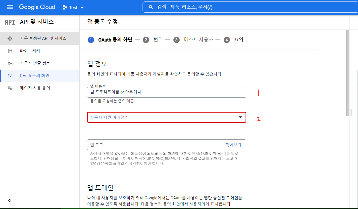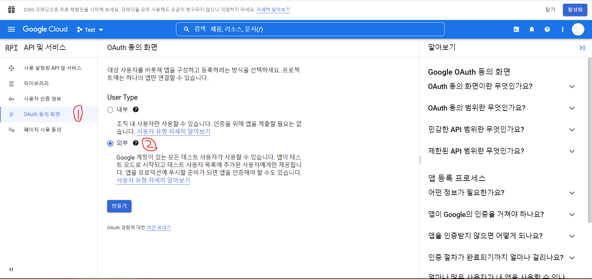 OAuth 동의 화면 - ** 외부로 하세요 나중에 변경가능하니까 괜히 내부했다가 오류 뜰 수도 ..?
