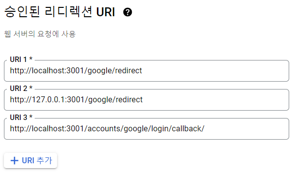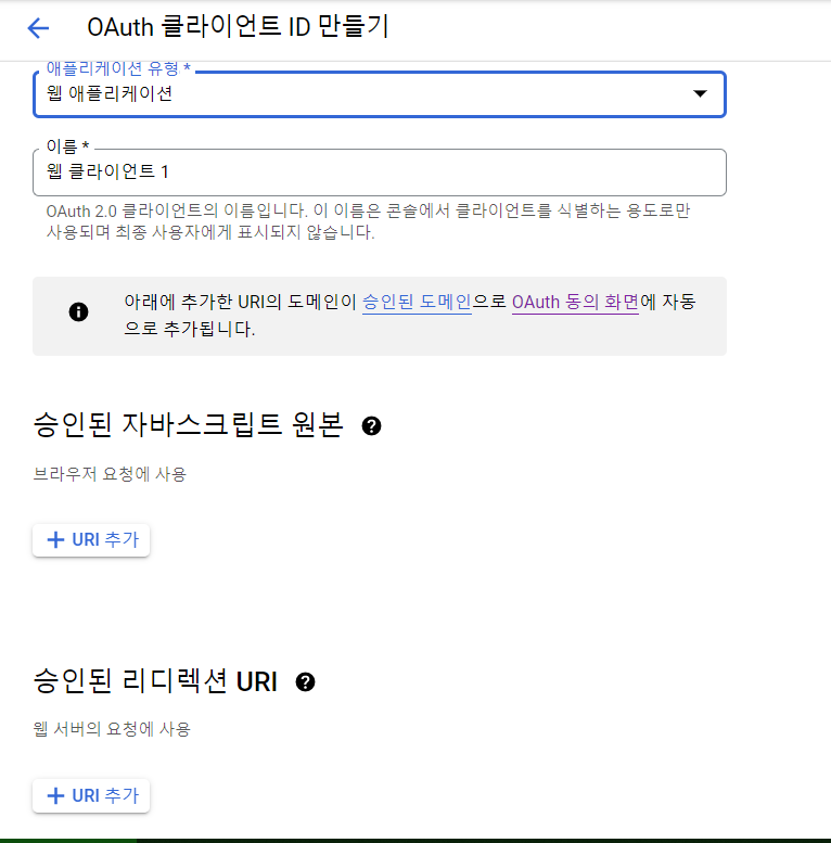 웹 애플리케이션으로 설정해주시고 이름 마음대로 하시고, 승인된 자바스크립트 원본에 URL 추가 누르셔서 http://localhost:3000 이거 넣고,승인된 리디렉션 URL 눌러서 http://localhost:3000/google/redirect 이거 넣고 만들기 눌러줍니다.