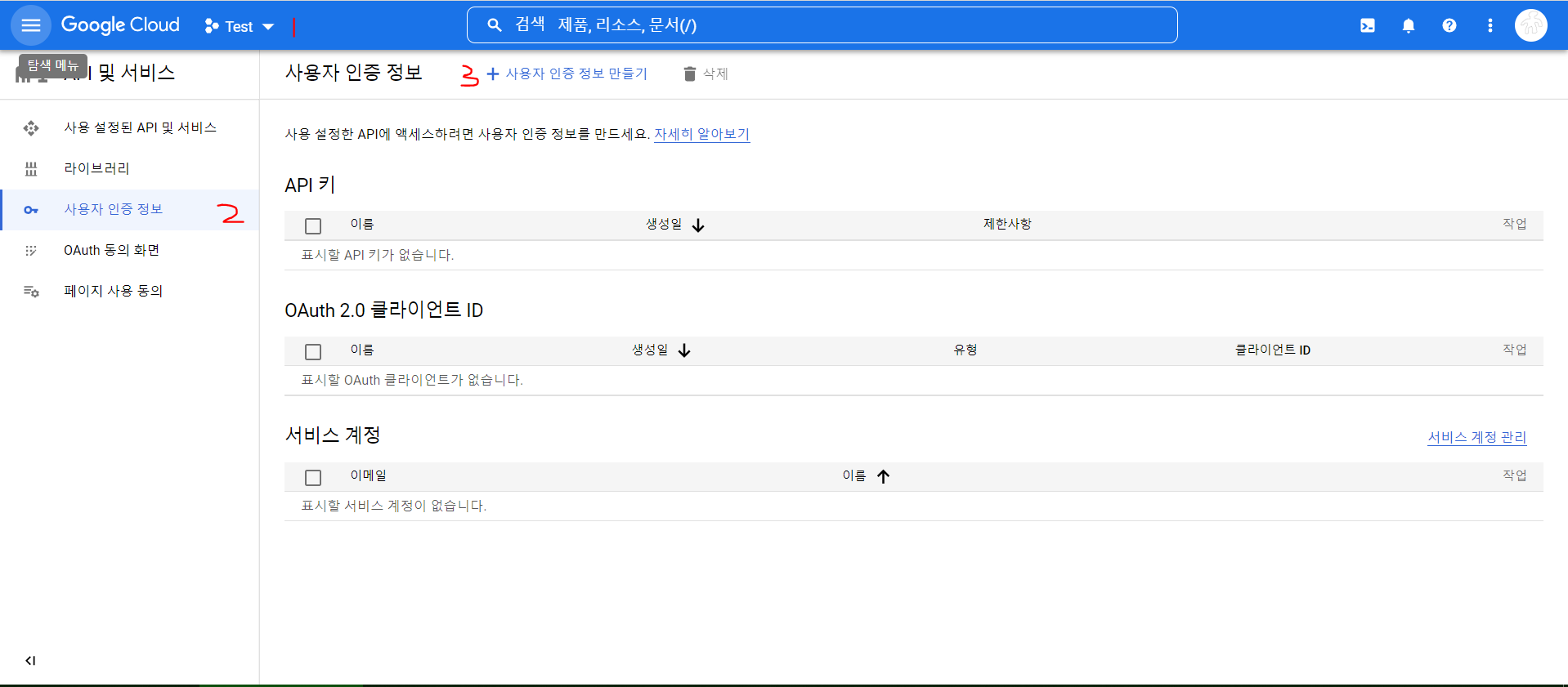 자기가 만든 프로젝트인지 확인해 주시고 사용자 인증정보- 사용자 인증 정보 만들기-OAuth 클라이언트 ID 눌러줍니다.
