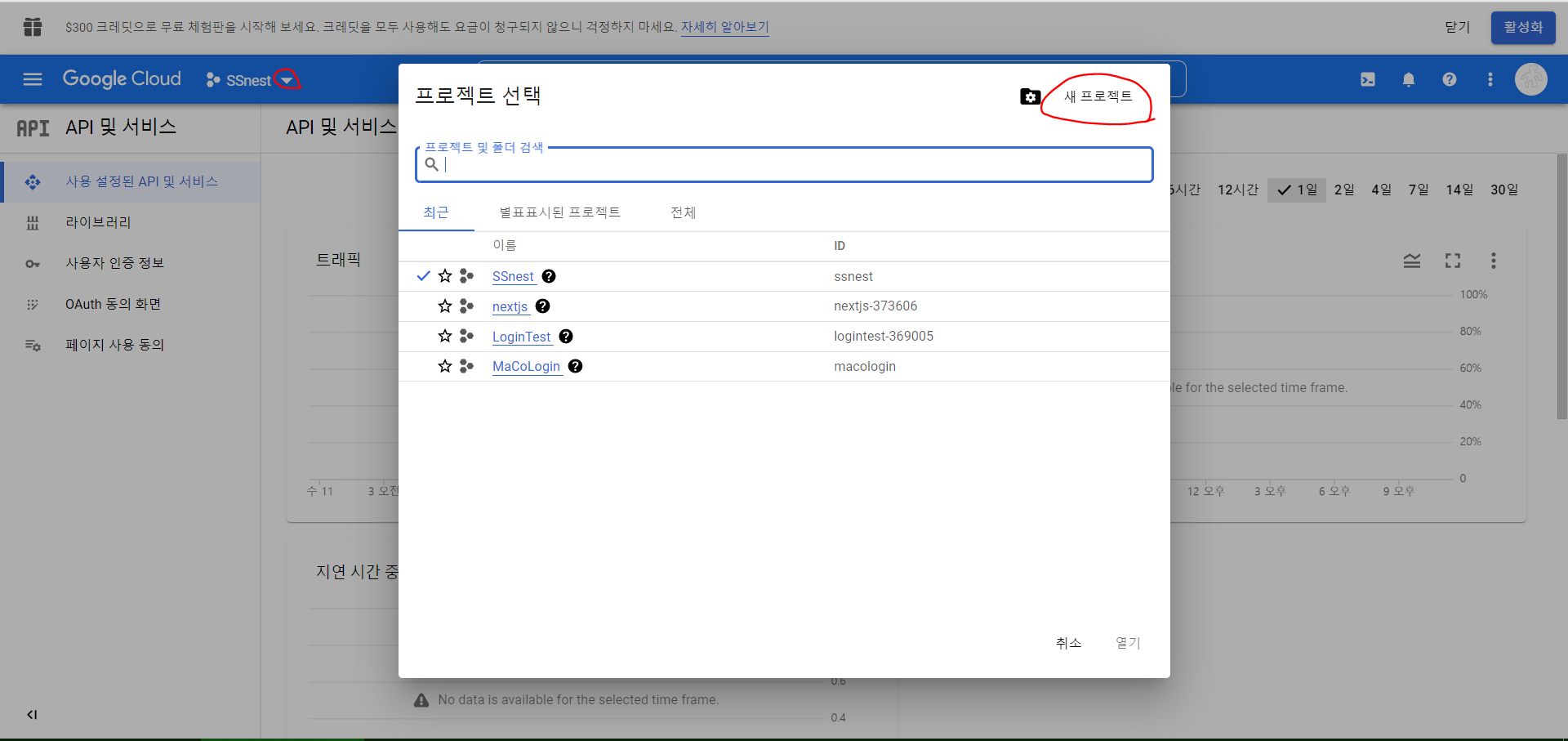 Google Cloud 옆 화살표 모양 누른다음에 새 프로젝트 생성